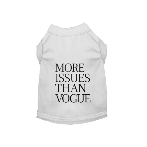 "More issues than vogue" dog dresses have become a popular trend among pet owners who love to pamper their furry friends with stylish and humorous attire. These sassy and chic outfits often feature playful slogans and fashionable designs that make a statement. Not only do they add a touch of personality to pets, but they also provide an opportunity for pet owners to express their own sense of humor and style. Perfect for special occasions, social media photos, or just a fun day out, these dresses ensure that pets are not only comfortable but also turn heads wherever they go. With a range of sizes and styles available, there's a "more issues than vogue" dress for every dog, making it a must-have addition to any pet's wardrobe.
