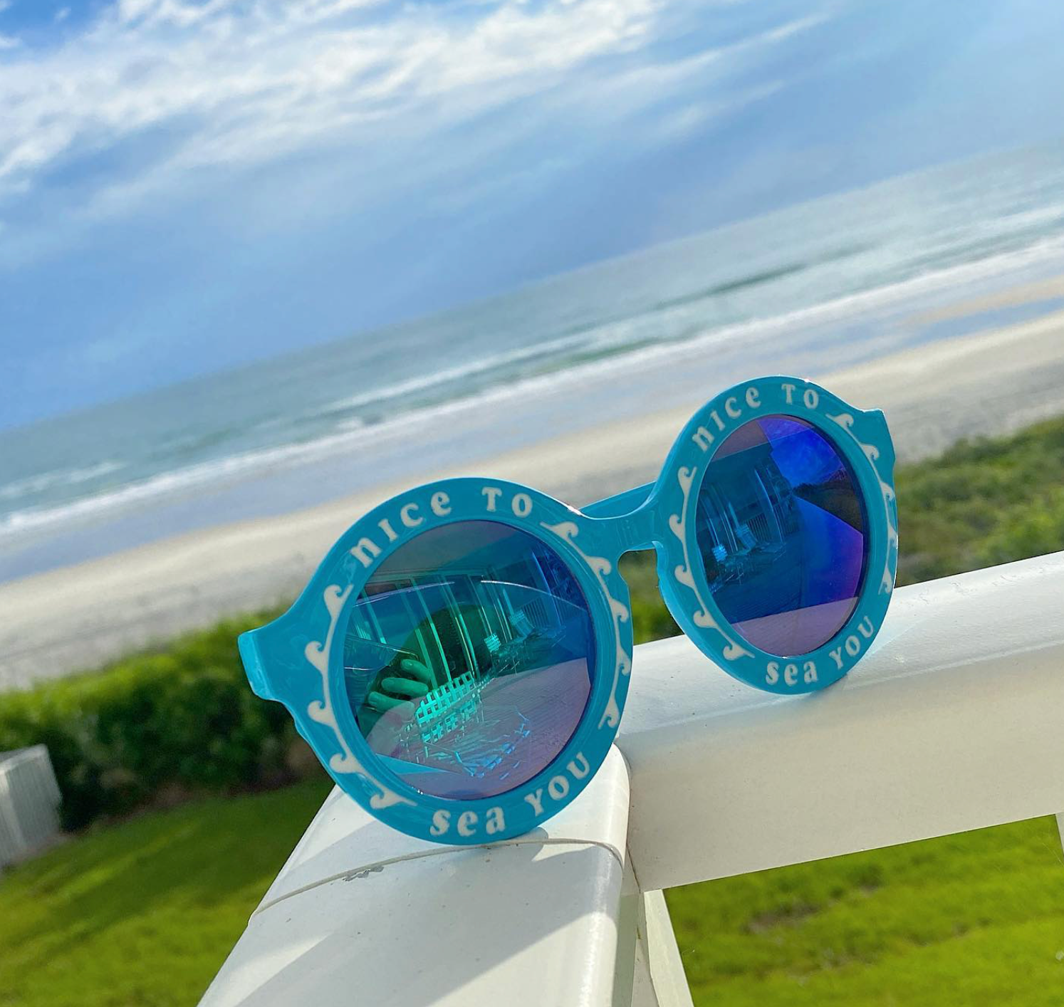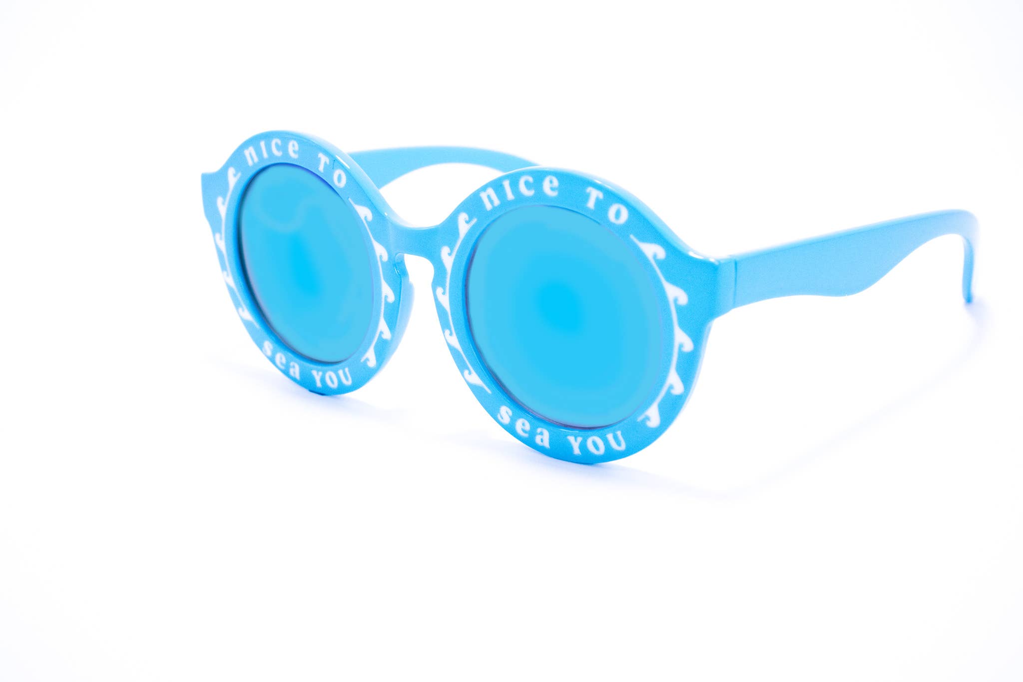 -OVERSIZED ROUND “RETROCHIC” SEAFOAM GREEN FRAMES -FEATURING “NICE TO SEA YOU” PHRASE IN WHITE -COMES WITH BLACK SCREEN PRINTED LOGO MICROFIBER SUNGLASSES CASE