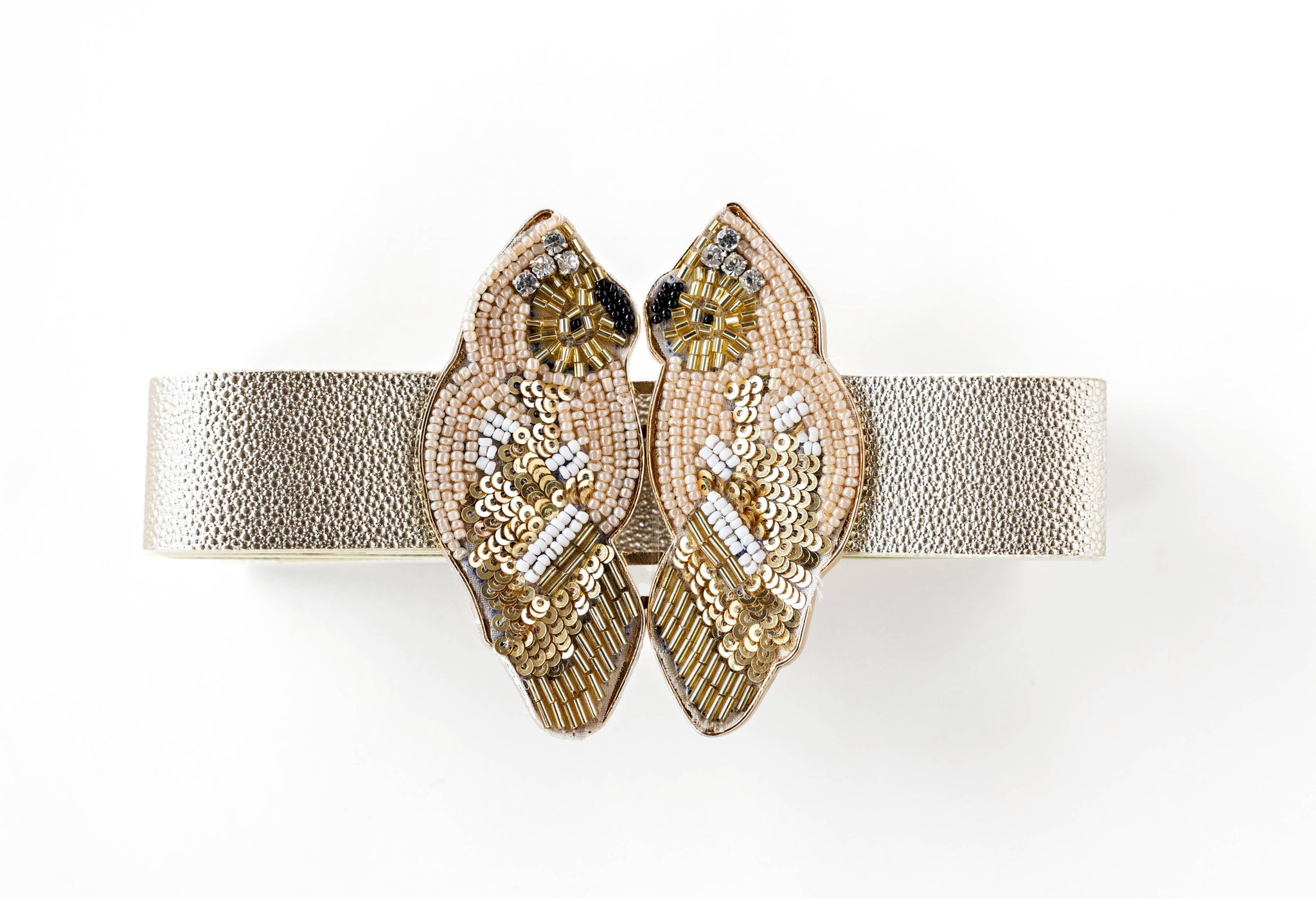 Hand beaded in India and imported to the US for Assembly, this set of interlocking gold plated buckles comes boxed with interchageable gold/ platinum reversible strap and and 2 cotton/ poly webbed ones. An edgier take on an old favorite!