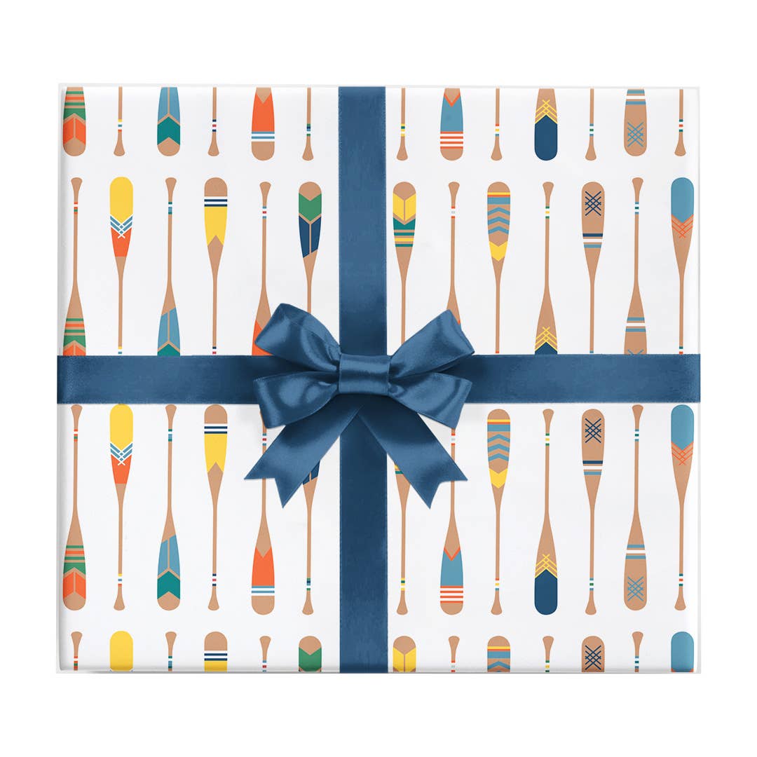 Inspired by summer camp at the lake, our paddles gift wrap is just what you need if you find yourself up creek. The perfect wrapping paper for an outdoor enthusiast. Offset printed in Colorado on SFI-certified matte paper using vegetable-based inks. PACKAGING: Each roll contains 3 sheets of paper wrapped around a core and shrink-wrapped. Each sheet of paper measures 19.5 x 27 inches (wraps a shirt box). NOTE THAT THIS IS NOT A CONTINUOUS ROLL OF PAPER.